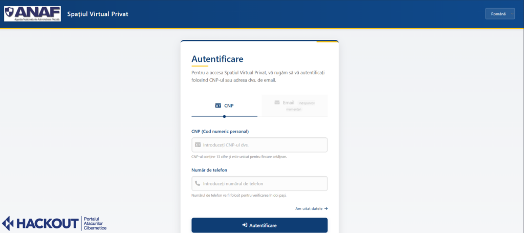 Odată ce utilizatorul apasă pe butonul sau linkul din email, este redirecționat către o pagină falsă, care nu aparține ANAF. În cazurile analizate de noi, victimele ajungeau pe domenii precum anaf-ro.web.app, scanned.page, anaf.life sau headlinemonitor.com. Deși unele dintre acestea conțin cuvântul „anaf” în denumire, ele nu au nicio legătură cu domeniul oficial anaf.ro.