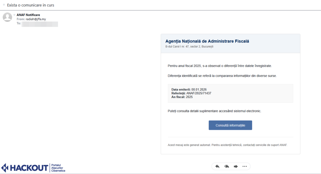 Totul începe cu un email fals, trimis de pe adrese care nu aparțin ANAF. Adresele oficiale ale instituției folosesc exclusiv domeniile @mfinante.ro sau @anaf.ro. Orice altă variantă nu este legitimă. ANAF nu va trimite niciodată mesaje de pe adrese personale, nominale sau de pe servicii publice precum @gmail.com, @yahoo.com sau altele similare.